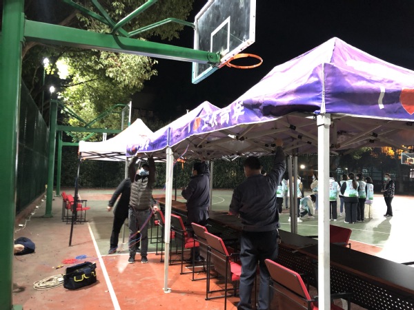 9日当晚安全保卫组立即对校门进行封闭管理,所有人员车辆只进不出,加强校内巡逻,主动劝返打算离校的人员,并且加强对校内各重点场所、人员密集场所的排查,为返校人员拟定临时安置场所;水电保障组迅速组织人员搬运桌椅、搭设帐篷、铺设线缆等工作,按规范要求布置校内集中核酸检测场地近2000平米,确保当晚核酸检测工作及时开展;餐饮保障组积极和各部门沟通,排摸统计校内人员情况,制定下一步餐饮保障方案。物资保障组立即统计各类防疫物资数量,对一线工作人员发放口罩、消毒液等物资。
