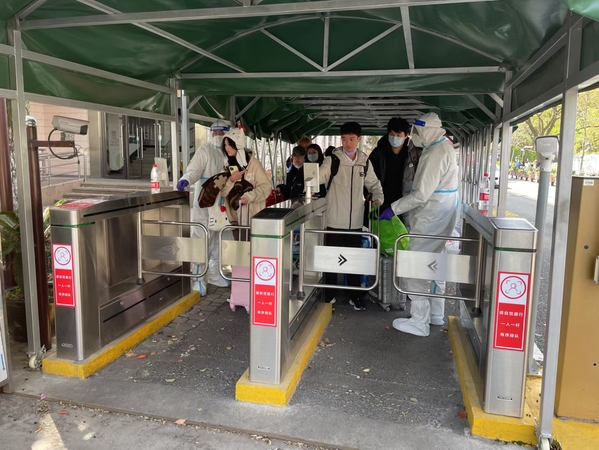 校园14天闭环管理期间,由于学校就一个校门出入口,校门区域事务繁多,除了常规的接收快递,还是一日四餐配送、分拣之地,各种物资卸货、分配之地,家长、家属送个人物资之地,防疫人员、车辆出入必经之地……队员们一遍一遍不厌其烦地登记检查、收警戒线、清洁消毒、恢复警戒线,经常还需做好搬运服务,在师生集中离校、进校时,认真仔细核对离校码、扫健康码,消杀车辆,一个一个细致的举动,保安队员们用自己的实际行动,时刻保卫校园安全。