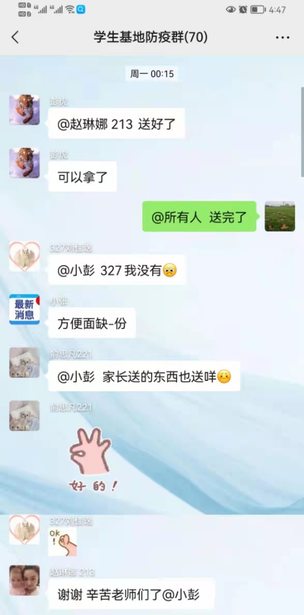 在人员少任务紧的情况下,迅速清理出60间宿舍并准备好了床上用品和日常生活用品,排查安全隐患,用时仅4个小时。当发现学生缺少基本防疫与生活物品时,想尽办法奔波多地凑齐。为及时解决学生需求,第一时间建立了联系群,24小时在线守候,小到房内物品使用,大到问医送药,并安抚学生情绪、处理并解决各种问题。