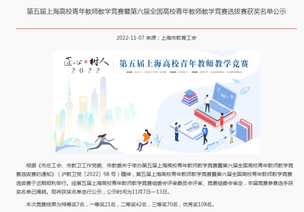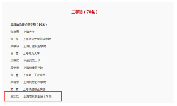 11月7日-13日,上海市教育工会公示了第五届上海高校青年教师教学竞赛暨第六届全国高校青年教师教学竞赛选拔赛获奖名单,学院三名教师获奖,其中,智工系赵文旻老师荣获高职高专综合学科一等奖,植科系徐菲老师荣获高职高专综合学科二等奖、马院王欢欢老师荣获思想政治理论课专项三等奖。