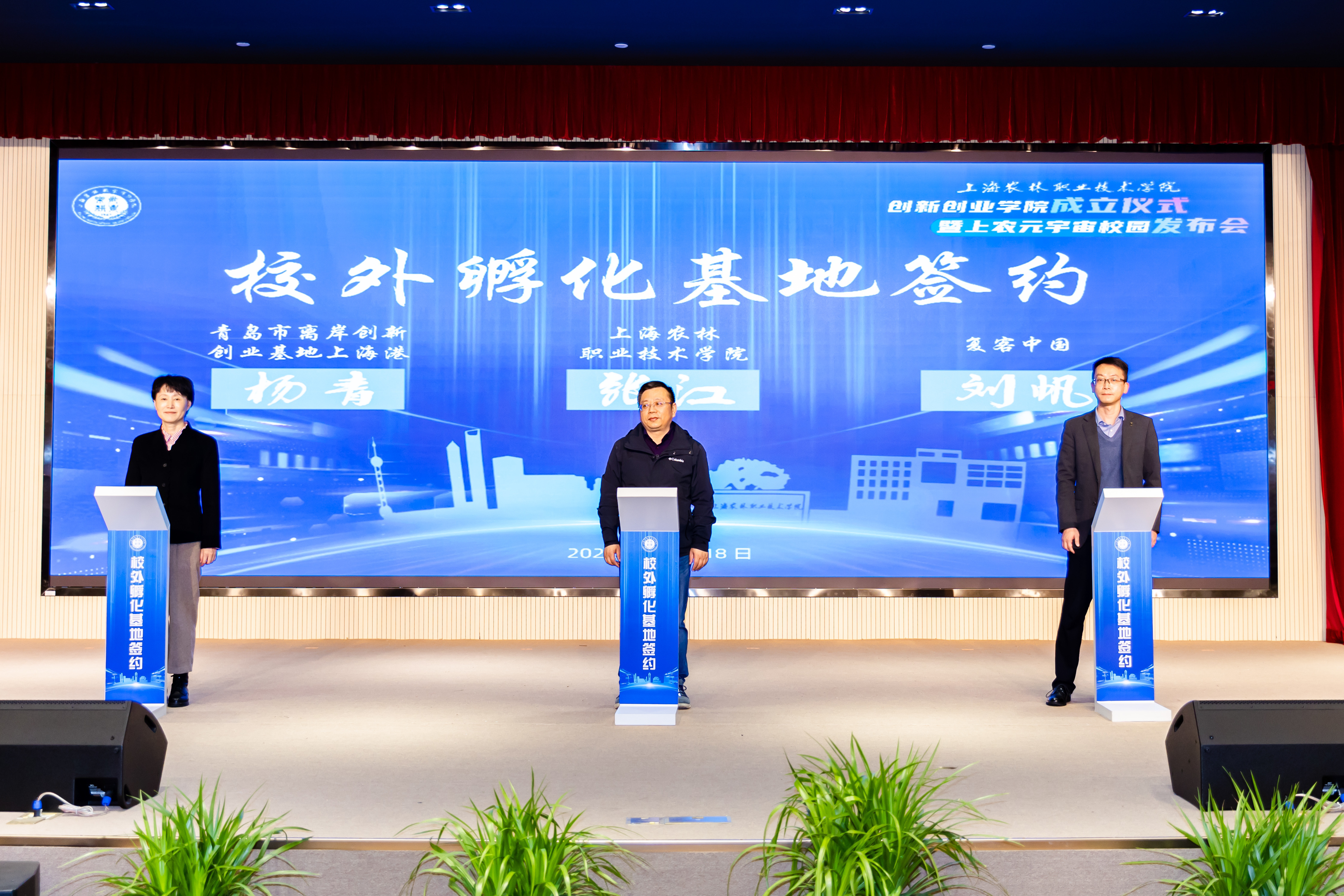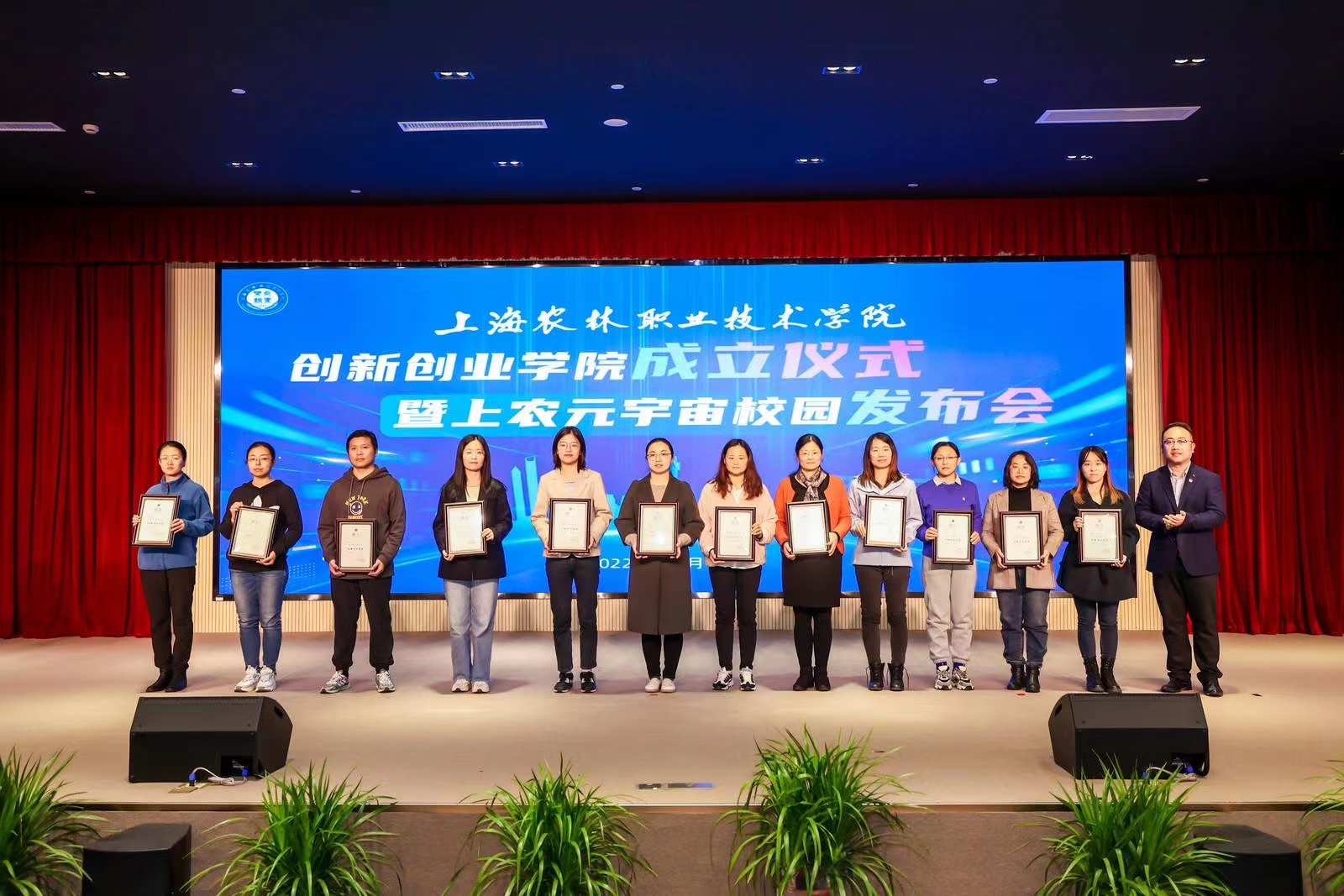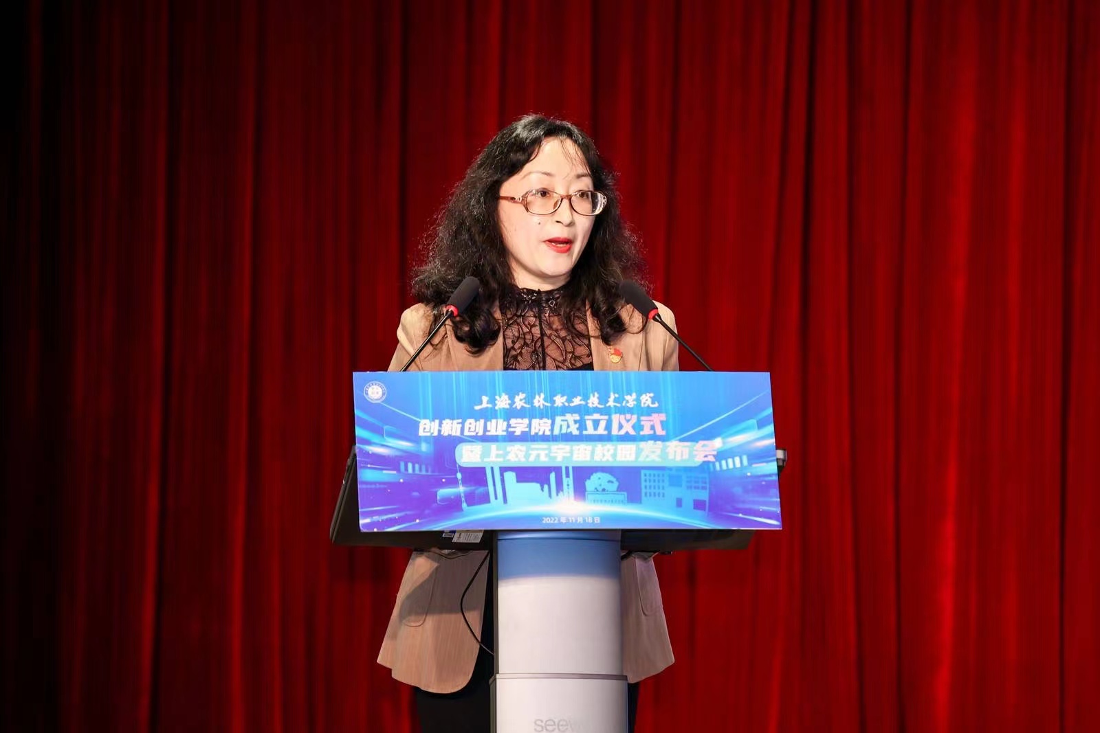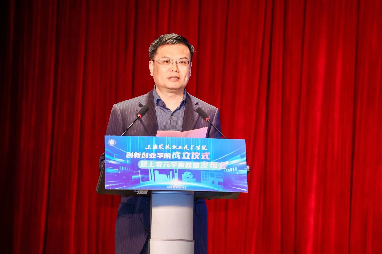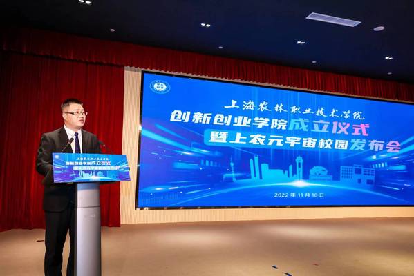 11月18日,在205报告厅,学校举行创新创业学院成立仪式暨上农元宇宙校园发布会,上海市学生事务中心副主任王涛,上海出版印刷高等专科学校党委副书记顾凯,上海城建职业学院党委委员、副院长郭洪涛,上海电子信息职业技术学院副院长方林中,长三角G60科创走廊联席办科创组组长、松江区科创发展办副主任宋苏伟,松江区人社局副局长马守亮,共青团松江区委员会副书记(主持工作)吕明远,上海市就业促进中心创业指导处创业培训科科长王婉芳,上海市高等教育学会高职高专创业教育专业委员会秘书长宋柏红,上海市学生事务中心双创服务部副部长宋琦,松江区就业促进中心副主任彭晓镝以及来自10余所兄弟院校双创工作负责人,校外双创导师代表,孵化企业代表,人民网、青年报等媒体记者和我校党政班子,相关职能部门负责人,党总支书记,团总支书记,双创导师代表,学生代表等参加成立仪式。党委副书记、副院长邵阳主持成立仪式。