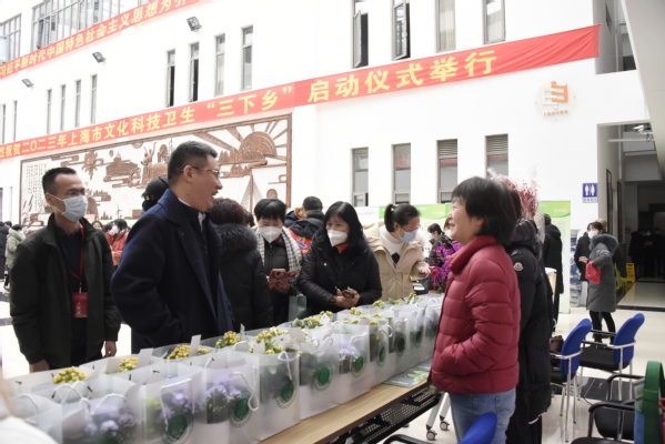 2月21日, 2023年上海市文化科技卫生“三下乡”启动仪式暨“文化育农”“科技惠农”“卫生健农”集中示范活动,在崇明区陈家镇新时代文明实践分中心举行。来自本市文化、农业、科技、卫生、医疗、法律、教育等近百名“三下乡”工作者为曹路镇村民和来沪工作者送农资、送农技、送法律咨询、送诊疗、送春联、送图书、送演出。