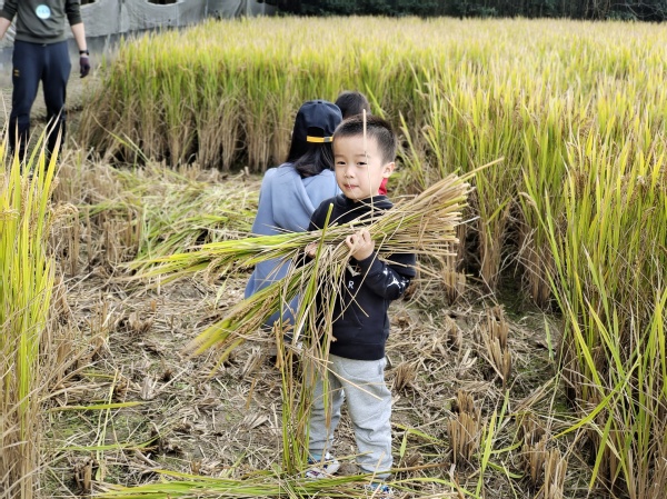 11月26日上午,来自西外幼儿园中六班的20余名小朋友来到基地,和爸爸妈妈一起体验了传统割稻、稻谷变大米等传统秋收项目,在体验秋收的同时,还利用秸秆、叶片等剩余原料,制作了属于自己的DIY稻草人和帆布包。