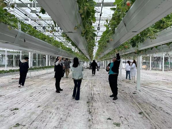最后,全体同学来到半封闭植物工厂,专业教师杨平为同学们介绍了国内半封闭植物工厂的发展现状、无土栽培的优点以及草莓植株性状、花果管理技术。同学们动手参与了草莓的疏花疏果及畸形果的摘除,并对草莓果实进行了品鉴。