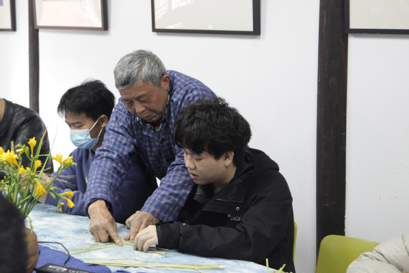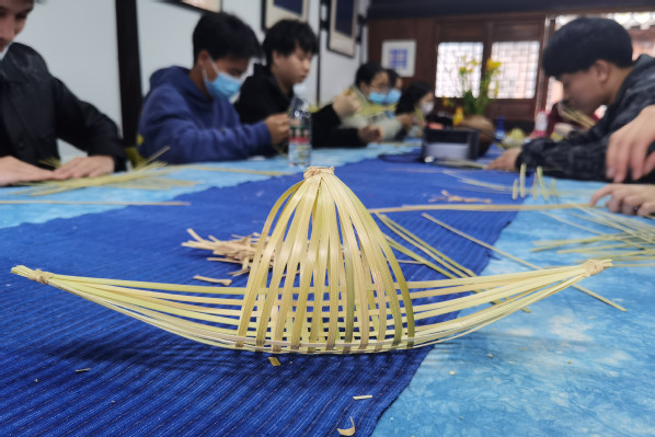 参观结束后,非遗竹编技艺传承人唐正龙老师从采竹、备料、浸泡、染色、编织、锁边六步骤为大家传授竹编知识和技艺,带领师生编织简易竹船。只见唐老师双手一拉、一插、一扎,反复几次,一条栩栩如生的小船就呈现在眼前。唐老师用生动的话语耐心讲解每一个步骤,学生们认真地边看边学边做,一条条小船在他们手中诞生。唐正龙是土生土长的松江人,擅长竹编技艺,被评为松江区级非物质文化遗产传承人,曾荣获2015年上海市民文化节市民手工艺大赛“百名市民手工艺达人”称号、2015年度松江区“百姓明星”家庭手工艺类“百姓明星”称号。