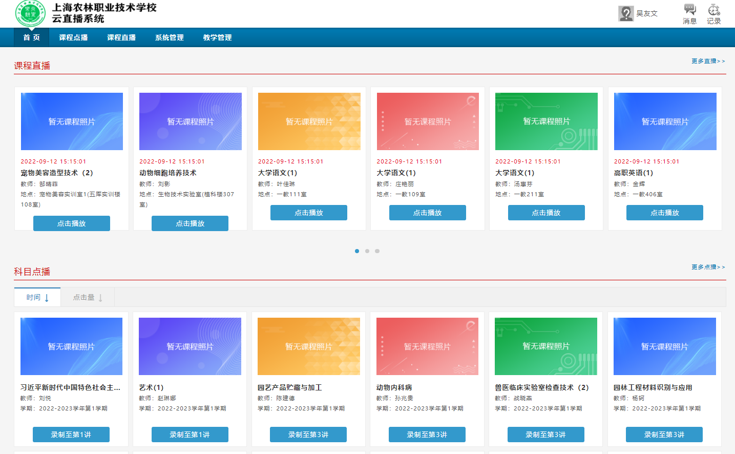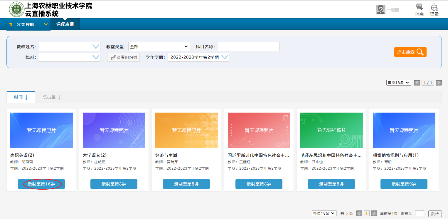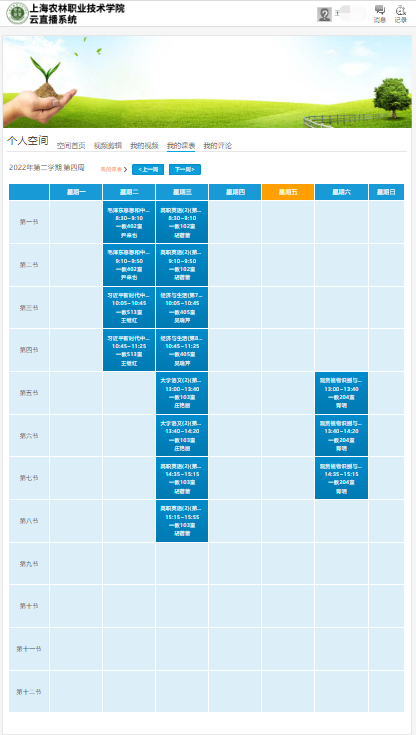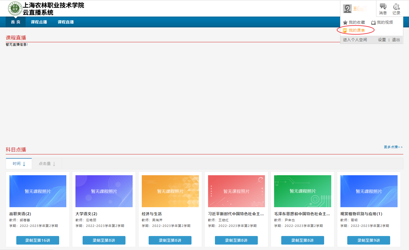6、把鼠标放置在页面右上角姓名的位置,在出现的下拉框中,点击“我的课表”,可看到云直播课表。建设了云直播系统的教室,所对应的课程,会出现在云直播课表中。
