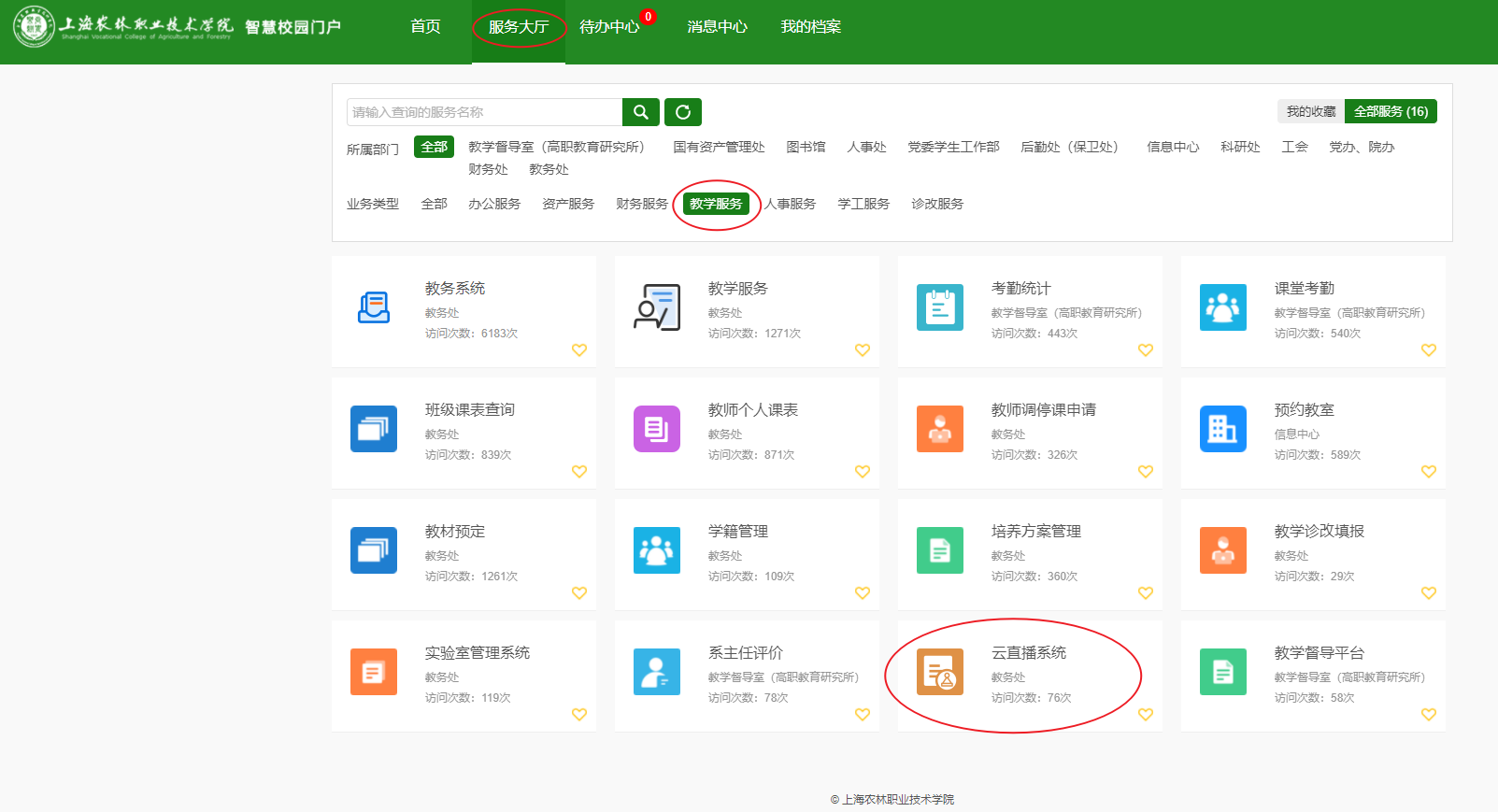 3、依次点击“服务大厅”“教学服务”“云直播系统”。
