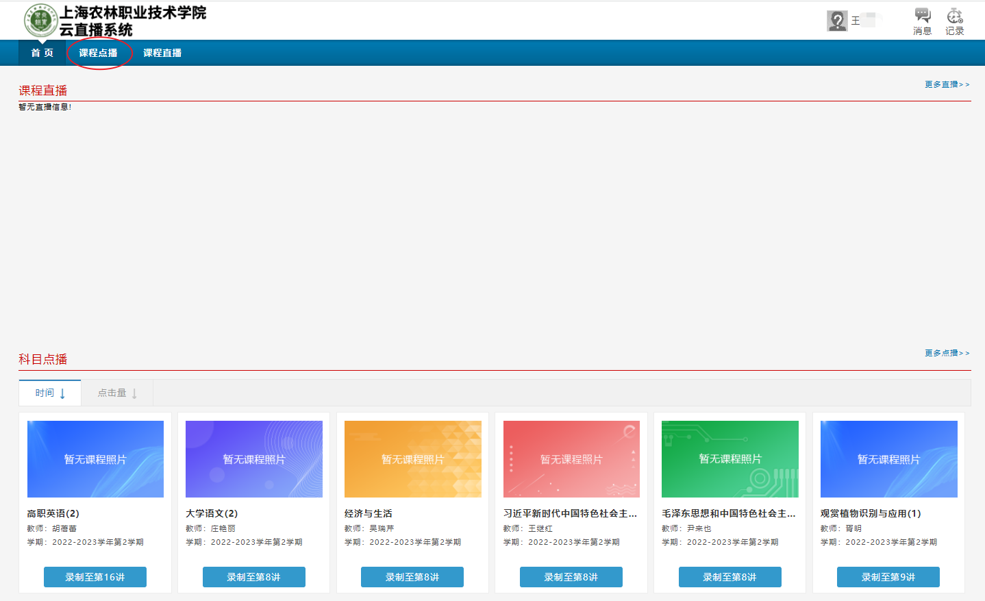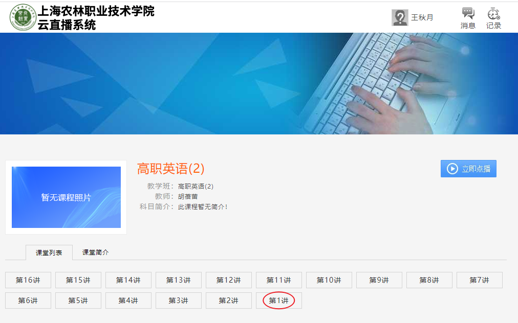 5、点击“课程点播”按钮,选择相应的课程,点击“录制至第XX讲”,进入课程页面,点击“第XX讲”,系统即可播放历史课程。