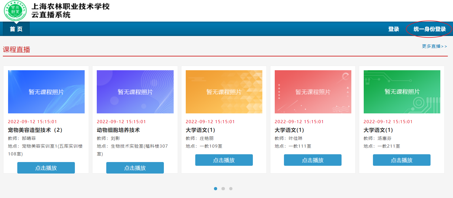 4、点击“统一身份登录”按钮,此时无需再输入密码,即可跳转到用户界面。选择相应的课程,点击“点击播放”按钮,观看云直播课堂。学生可以提前5分钟进入云直播课堂。