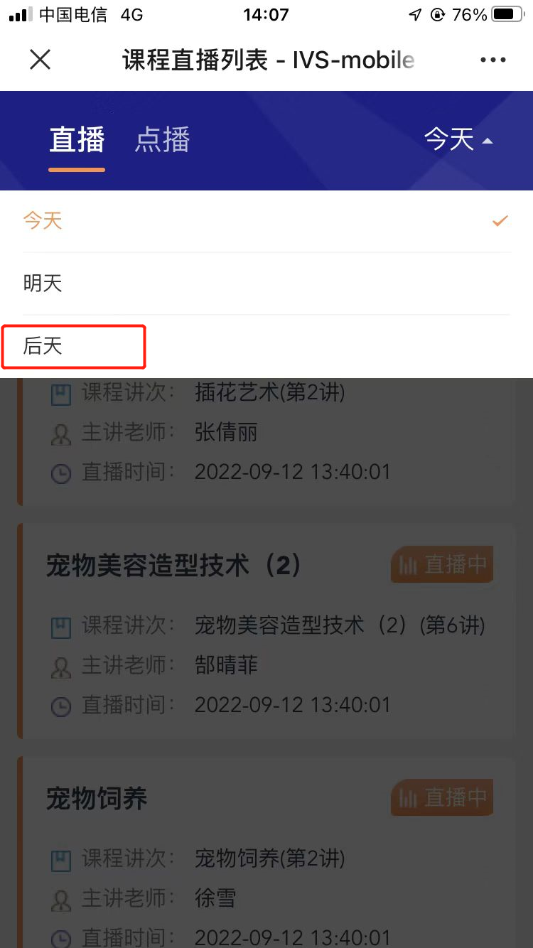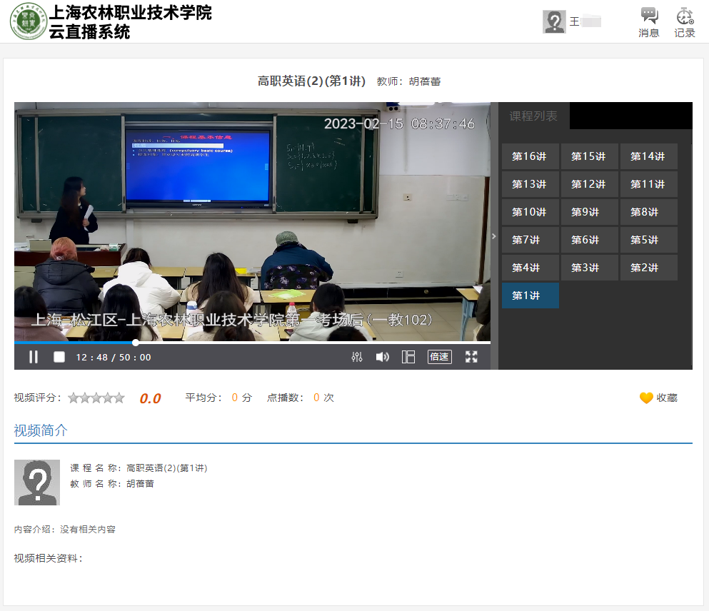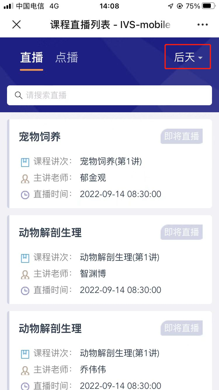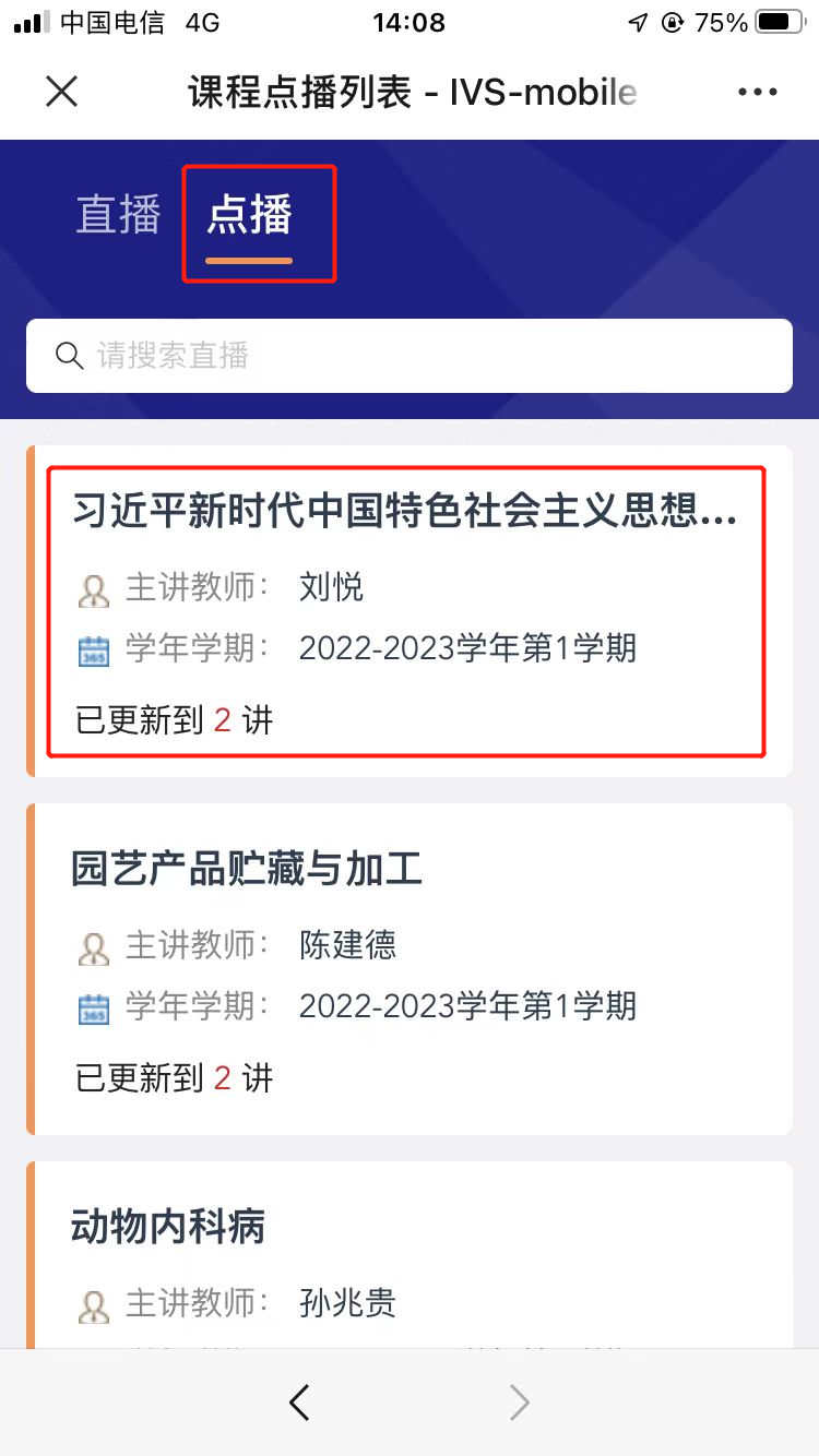 对于历史云直播课程,学生可点击“点播”页签,进入课程的点播选集,选择课程讲次,复习之前的课程。