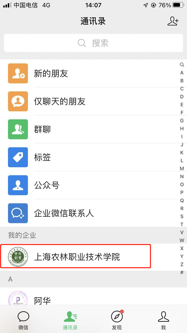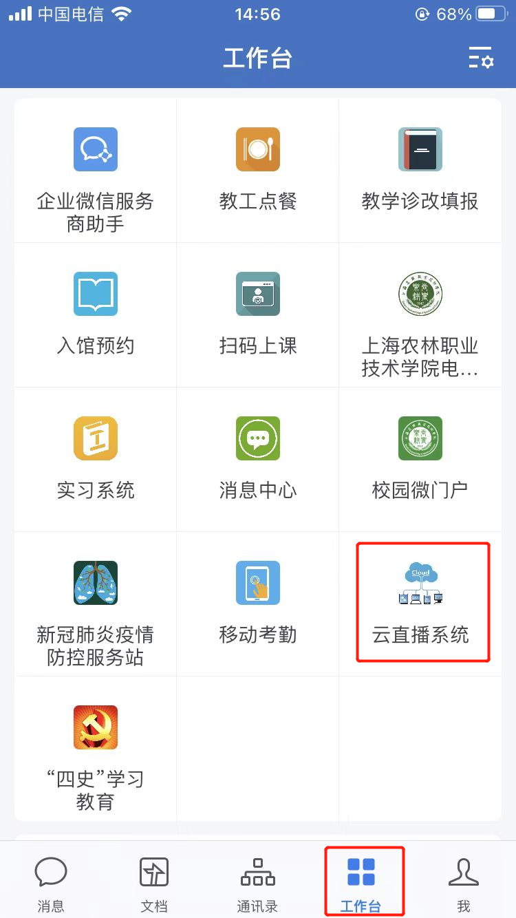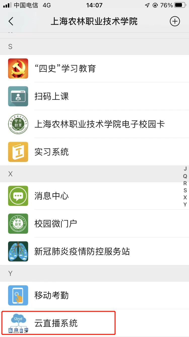 学生也可以通过微信通讯录,进入我的企业“上海农林职业技术学院”,点击“云直播系统”。但不建议使用这种方式,因为通过微信观看云直播时,查看微信消息需要退出云直播,而且企业微信APP中的云直播系统更加稳定。