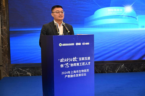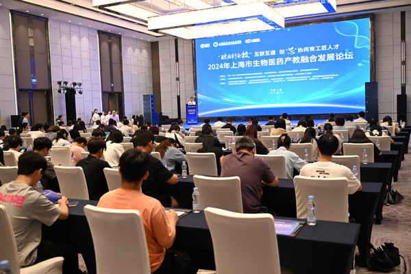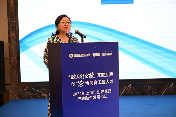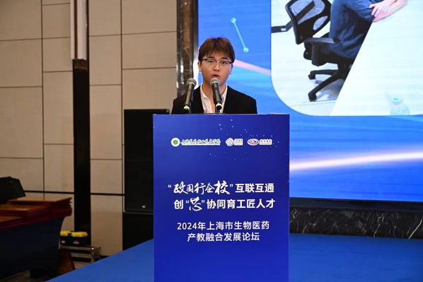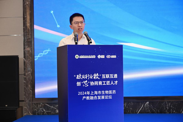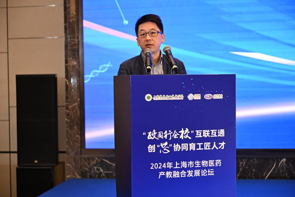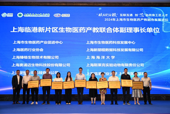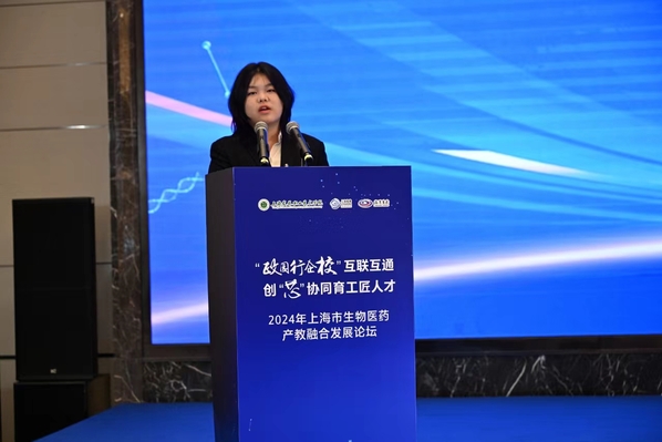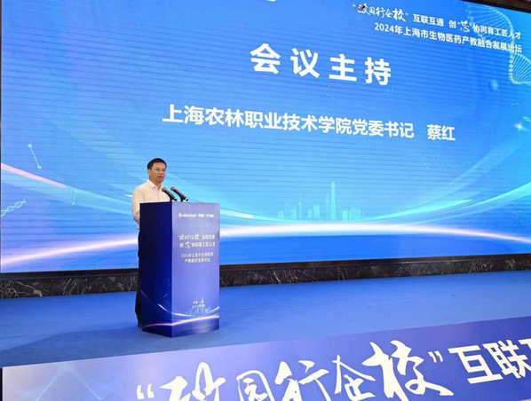 6月25日,一场汇聚了政府、园区、行业、企业、学校等多方力量的生物医药产教融合发展论坛在上海临港新片区生命蓝湾园区隆重举行。本次论坛以“‘政园行企校’互联互通,创‘芯’协同育工匠人才”为主题,旨在通过深化产教融合,推动生物医药产业与人才的高质量发展。上海市教育委员会职教处处长马建超,临港新片区管理委员会发改处副处长庄青松、社发处副处长方娟、社发处副处长鲁尧,上海临港产业大学校长王春华,上海医药行业协会秘书长夷征宇,上海市生物医药产业促进中心部长陈明伟,及上海海洋大学、上海应用技术大学和上海健康医学院等院校领导、代表,首批30余家产教联合体理事单位、相关生物医药企业代表、教师代表和学生代表共200余人参会。上海农林职业技术学院党委书记蔡红主持活动。