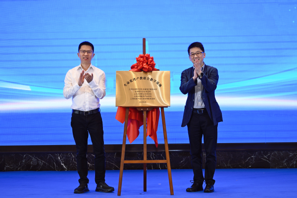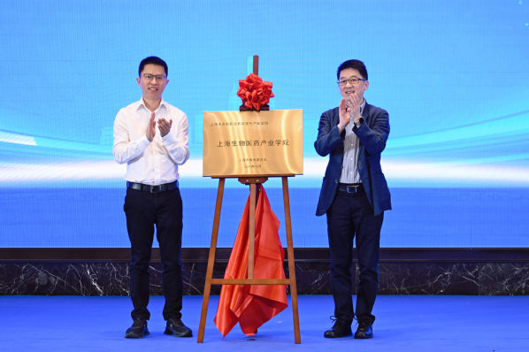 市教委职教处处长马建超、临港新片区管委会发改处副处长庄青松共同为上海生物医药产业学院和生命蓝湾产教联合教学基地揭牌