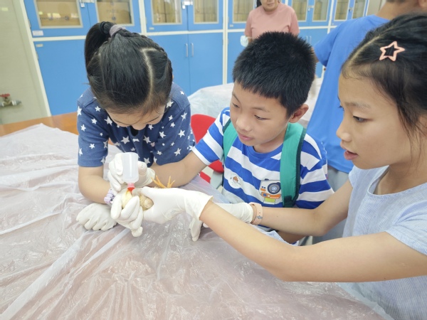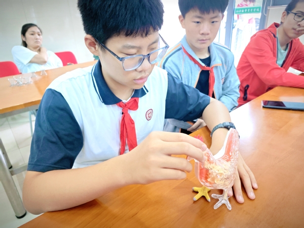 在“蛋生记”体验活动上,俞越晖和但仁老师让同学们通过观察蛋的孵化过程,了解卵生动物的生命周期和生物学知识。在老师的讲解下,同学们深入了解蛋的构造和变化,并通过自己动手拼模型了解小鸡的内部结构,增强同学们爱护动物、尊重生命的情感。