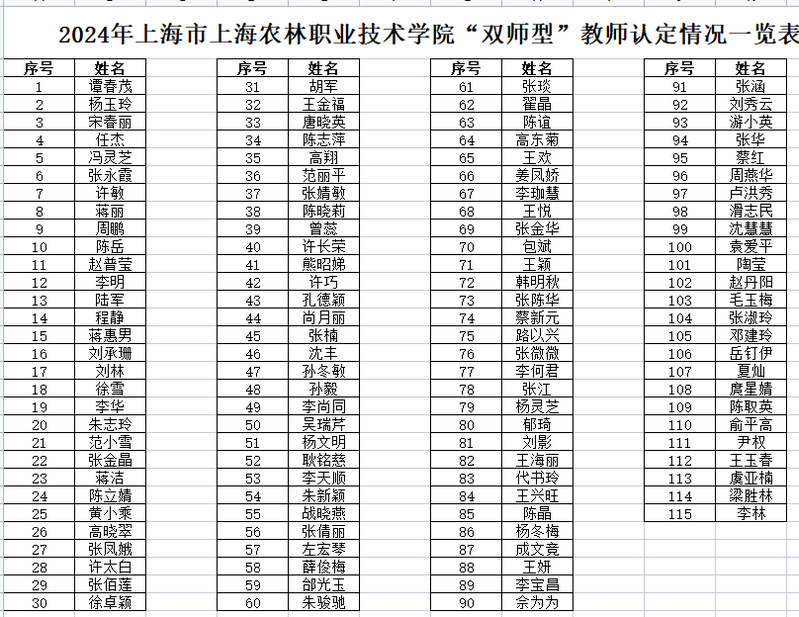 2024年上海市上海农林职业技术学院“双师型”教师认定情况一览表