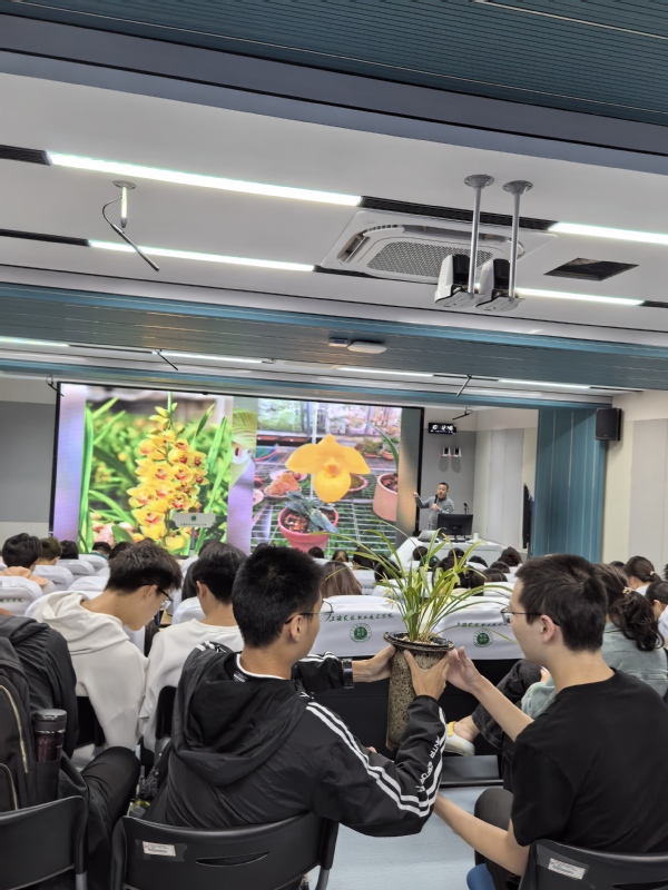 为了能让同学们对国兰的“香、色、瓣、韵、姿”有一个直观的了解,王会长为同学们带来了盛花期的建兰与拔杆期的寒兰。接着从兰花的品种、瓣型、生长习性与分布情况等植物专业知识讲到以国兰为题材的诗、画、曲、文和佚事趣闻,以及兰花产业未来持续增长的需求力与科技推动产业创新及国际合作的新机遇,也寄希望于在座每位同学,运用自己所学的专业知识为国兰产业发展与助力乡村振兴添砖加瓦。