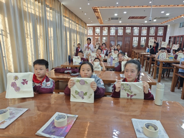 植物识别环节结束后,学生们把亲手采摘的植物通过艺术创作进行拓印。在老师的指导下,学习了植物拓印的基本原理与方法,他们认真地将花草在帆布包上摆放成自己设计的图案上,用鹅卵石轻轻敲打,使植物的汁液渗透到布上,留下美丽的纹理和色彩。拓印过程中,学生们充分利用植物的不同色彩进行搭配与创作,完成了一幅幅独一无二的作品。