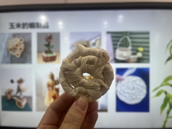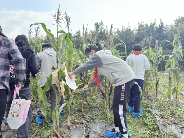 当天下午,阳光正好,实训基地教师在玉米地旁为孩子们搭建起了田间课堂,现场讲解了玉米的结构、种类以及用途等。随后,学生们在实操环节进行了玉米采收,并小心翼翼地将玉米外皮剥下,仔细地撕成1-2厘米宽的长条,在老师的指导下编制出独属于自己的玉米皮杯垫。看着自己的作品,每位同学脸上不仅洋溢着收获的喜悦,更体会到生活的智慧,感叹玉米浑身都是宝。