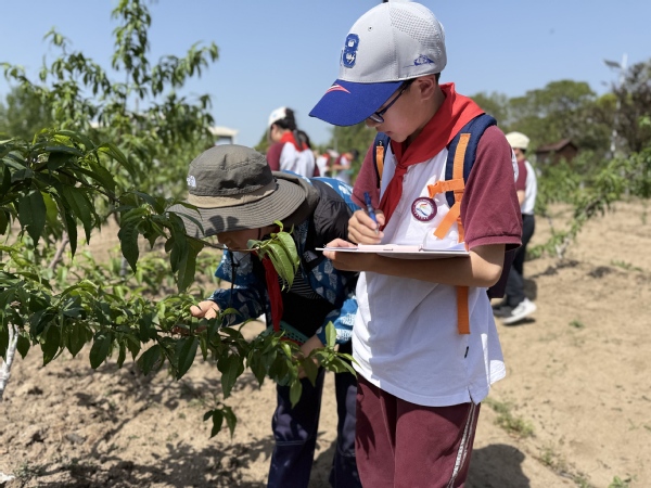走进桃树、梨树实训园,挂满小果实的桃树、梨树整齐排列在同学们的眼前。“同学们知道今天要疏果,是把什么样的果疏下来呢”“朝天果、发育不良果、畸形果”同学们整齐回答道,带队老师进行补充。同学们被划分成2人一组一棵树,开始了紧张的疏果工作。从书本知识回归到劳动。在学习中实践,在实践中学习。