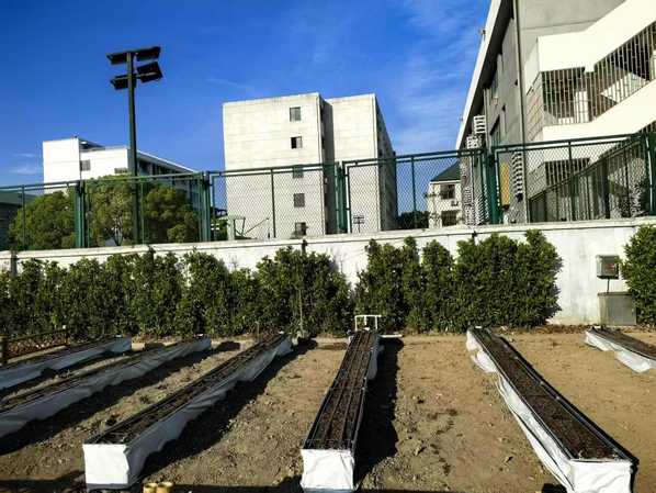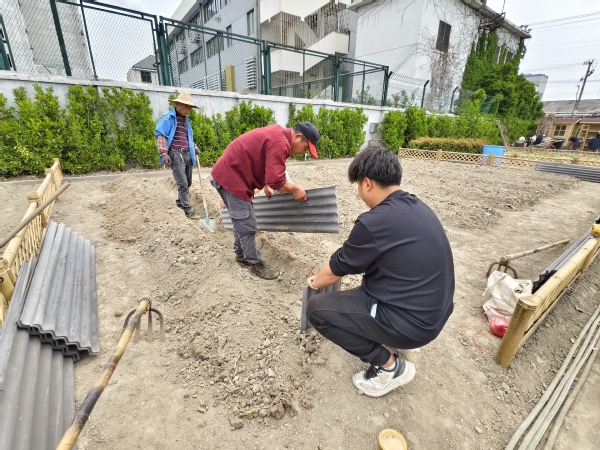 老师们针对学校场地条件与要求,提出在场地内安装便于栽培的栽培槽,采用无土栽培的方式进行种植,同时使用滴灌的灌溉方式,在节水的同时,还能实现水肥一体化。在实地考察场地后,老师们更换了更换了原本植物栽培槽的设计构想,采用石棉瓦等材料,依托场地土地条件,打造了更“接地气”的栽培槽,在安装完毕之后还进行了番茄苗的定植。