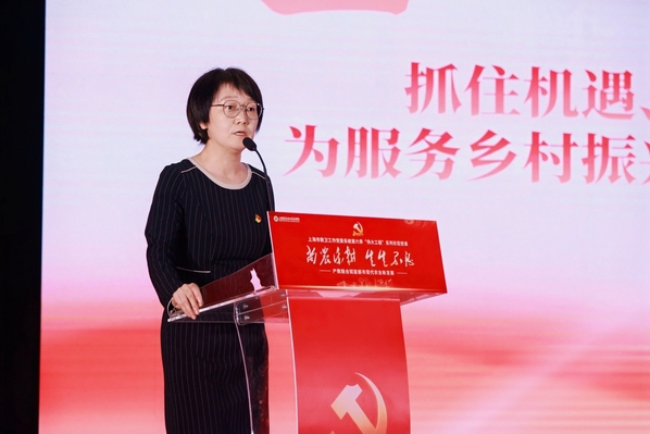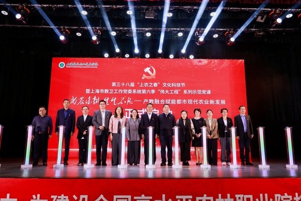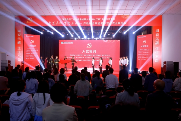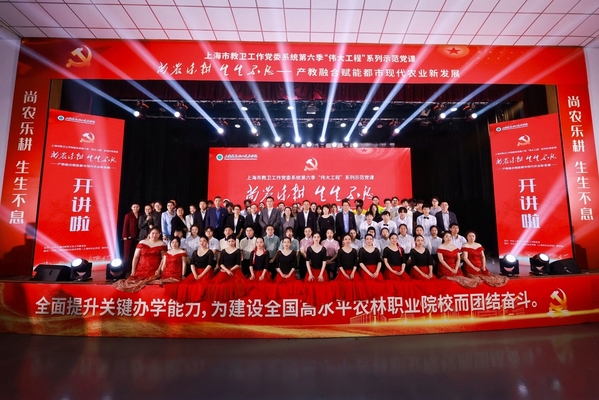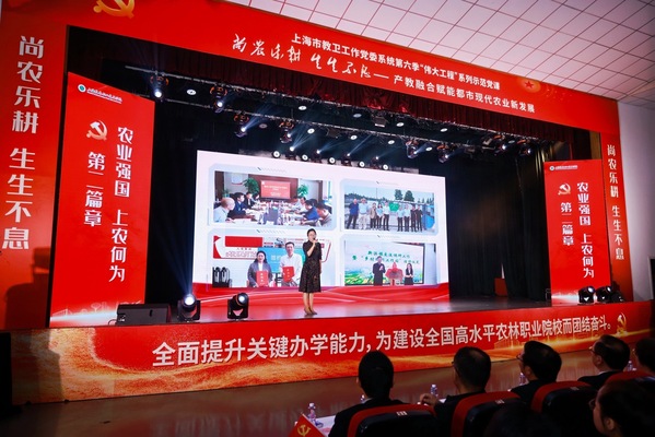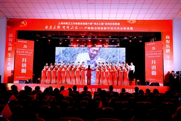 5月8日下午,上海市教卫工作党委系统第六季“伟大工程”系列示范党课之“尚农乐耕 生生不息——产教融合赋能都市现代农业新发展”主题党课在我校举行。市教卫工作党委组干处副处长朱晨光,团市委学校工作部副部长周薇,上海市教师教育学院党建工作部部长张美艳,松江区党建服务中心主任金晓燕,岳阳街道党工委委员、纪工委书记车逸,叶榭镇党委委员金杭萍,党政领导班子成员,全体中层干部、党员,师生代表近500余人参与观摩。