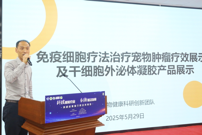 都市动物健康科研创新团队负责人滑志民展示宠物细胞治疗技术成果,拓宽农业科技应用领域。