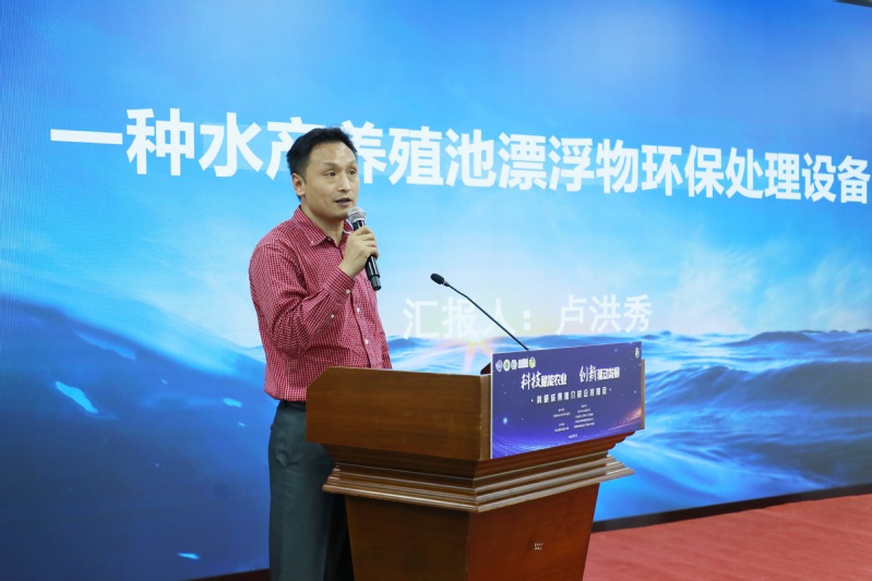 低碳与绿色农业科研创新团队负责人卢洪秀进行“一种水产养殖池漂浮物环保处理设备”专利展示,凸显科技对水产养殖绿色可持续发展的重要意义。