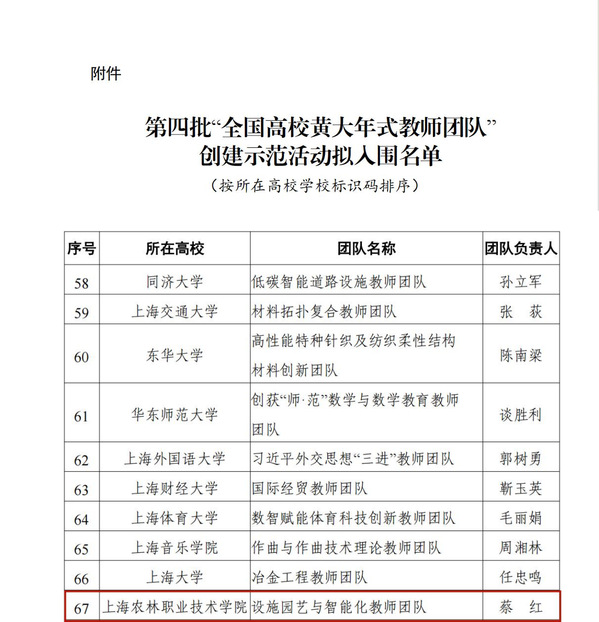 近日,教育部发布《关于第四批“全国高校黄大年式教师团队”创建示范活动拟入围名单的公示》。学校设施园艺与智能化教师团队成功入选。上海市共有11个黄大年式教师团队,我校是唯一入选的高职院校。
