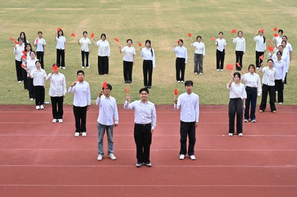 仪式最后,全场师生共同挥动手中的红旗,齐声合唱《歌唱祖国》。激昂的旋律、嘹亮的歌声回荡在校园上空,既是师生对祖国的深情礼赞,也展现了团结奋进、昂扬向上的精神风貌,进一步激发了大家的爱国热情与民族自豪感。团员青年们身着统一白色衬衫,胸前团徽熠熠生辉,他们精神抖擞、列队成心形,以青春之名传递赤子之情,用真挚行动表达对祖国的美好祝福。